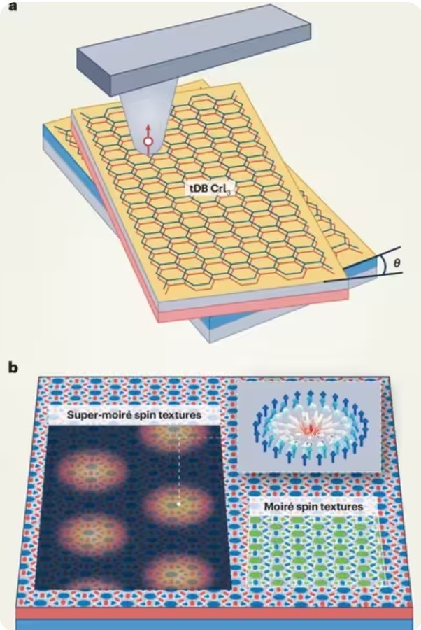 а. Магнитную структуру tDB CrI3 визуализировали с помощью сканирующей квантовой микроскопии с использованием NV-центра (показан красной стрелкой). б. Наблюдаемые сверхмуаровые спиновые текстуры охватывают несколько муаровых суперячеек, тогда как обычные муаровые текстуры ограничены одной суперячейкой. На фоне показаны взаимодействия между внутренними магнитными слоями (красный и синий), варьирующиеся от ферромагнитных (синий) до антиферромагнитных (красный). Источник: Kim, KM. Super-moire spin textures revealed. Nat. Nanotechnol. (2026). https://doi.org/10.1038/s41565-026-02123-2