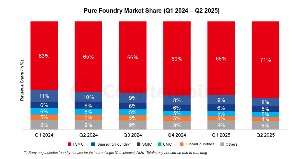 Первое место занимает тайваньская TSMC, причем она заметно упрочила свои позиции: за год доля увеличилась на 6%. За тот же период Samsung потеряла 2% рынка, SMIC, UMC, GlobalFoundries и остальные участники потеряли по 1% рынка.