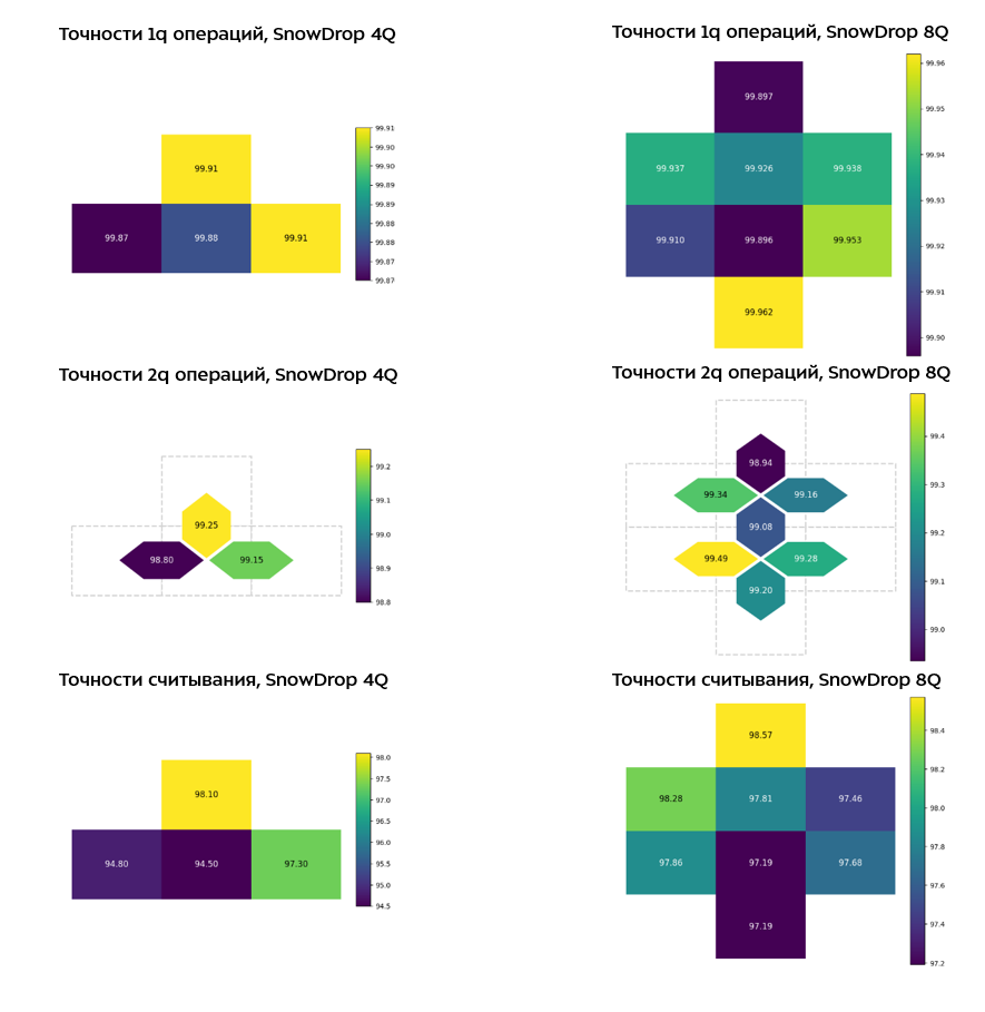 - сверхпроводниковый квантовый сопроцессор SnowDrop 4Q – 4 кубита, точность однокубитных операций 99,892%, двухкубитных 99,06%, считывания 96,17%.