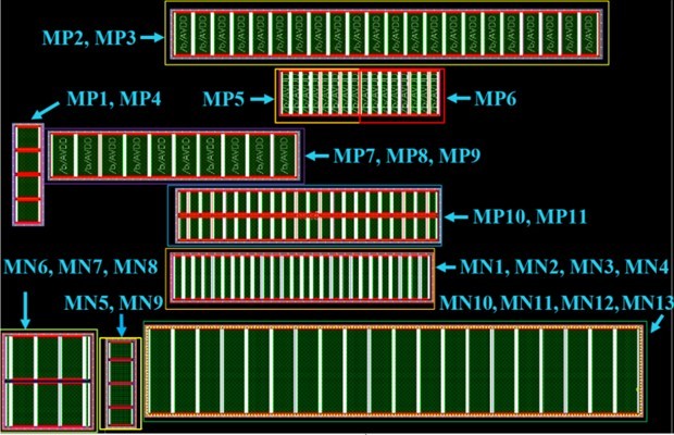 Транзисторы MN1, MN2, MN3, MN4 согласованы путём размещения в одномерном массиве с общей осью симметрии для каждой группы: слева расположены транзисторы MN1, MN2; справа – транзисторы MN3, MN4. Аналогичным образом построен массив транзисторов MN10, MN11, MN12, MN13: слева расположены транзисторы MN10, MN11; справа – транзисторы MN12, MN13.