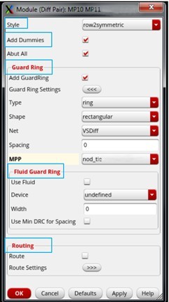 Для объединения согласованных транзисторов дифференциальной пары воспользуемся базовым модулем – Module (Diff Pair). Появляющееся окно позволяет задать настройки будущего массива (рисунок 3):