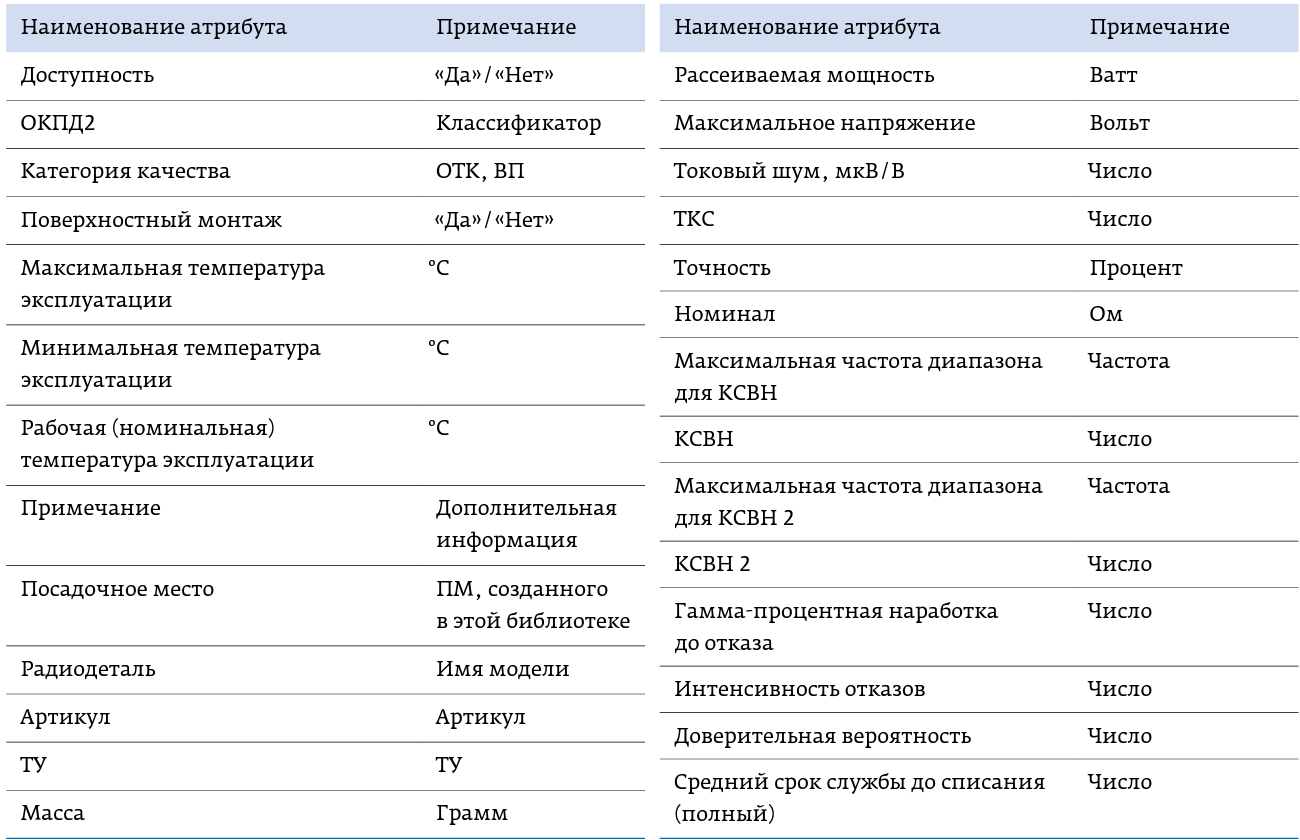 Таблица 1. Пример атрибутов для резисторов в САПР Delta Design
