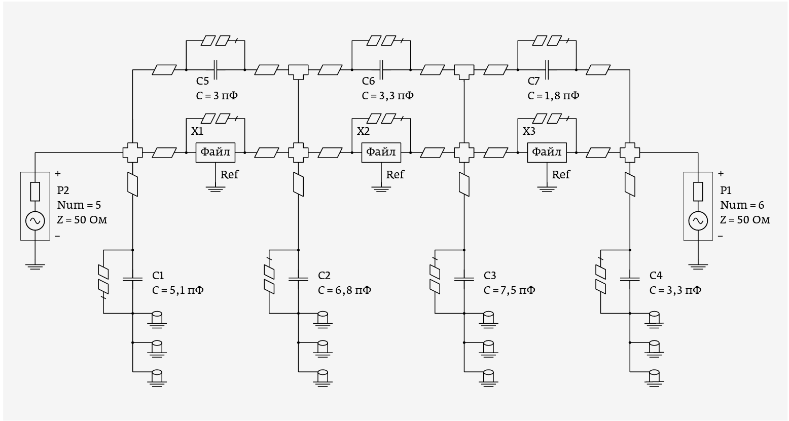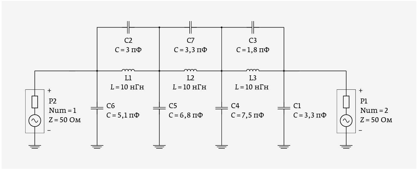Рис. 4. Модель ФНЧ с моделями чип-индуктивностей и топологической структурой