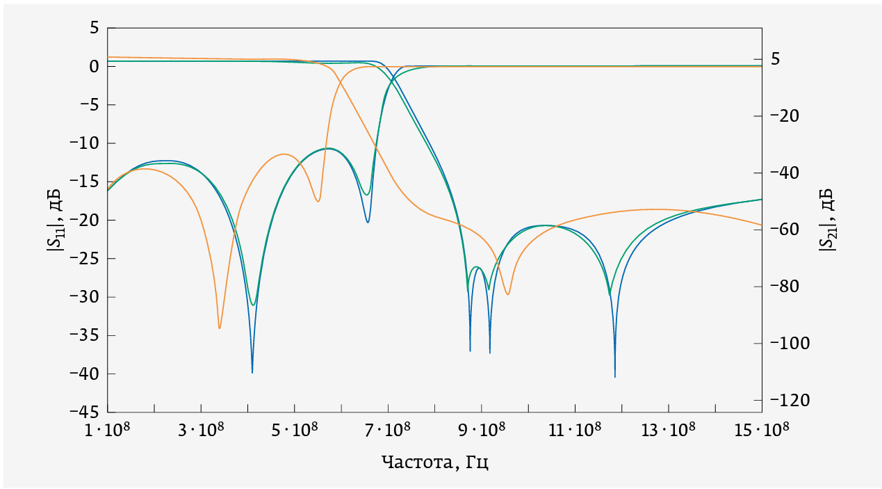 На рис. 5 представлены частотные характеристики идеального фильтра в сопоставлении с характеристиками того же фильтра при замене идеальных элементов моделями чип-индуктивностей КИК 0603 10 нГн, а также характеристики с учетом влияния топологических неоднородностей.