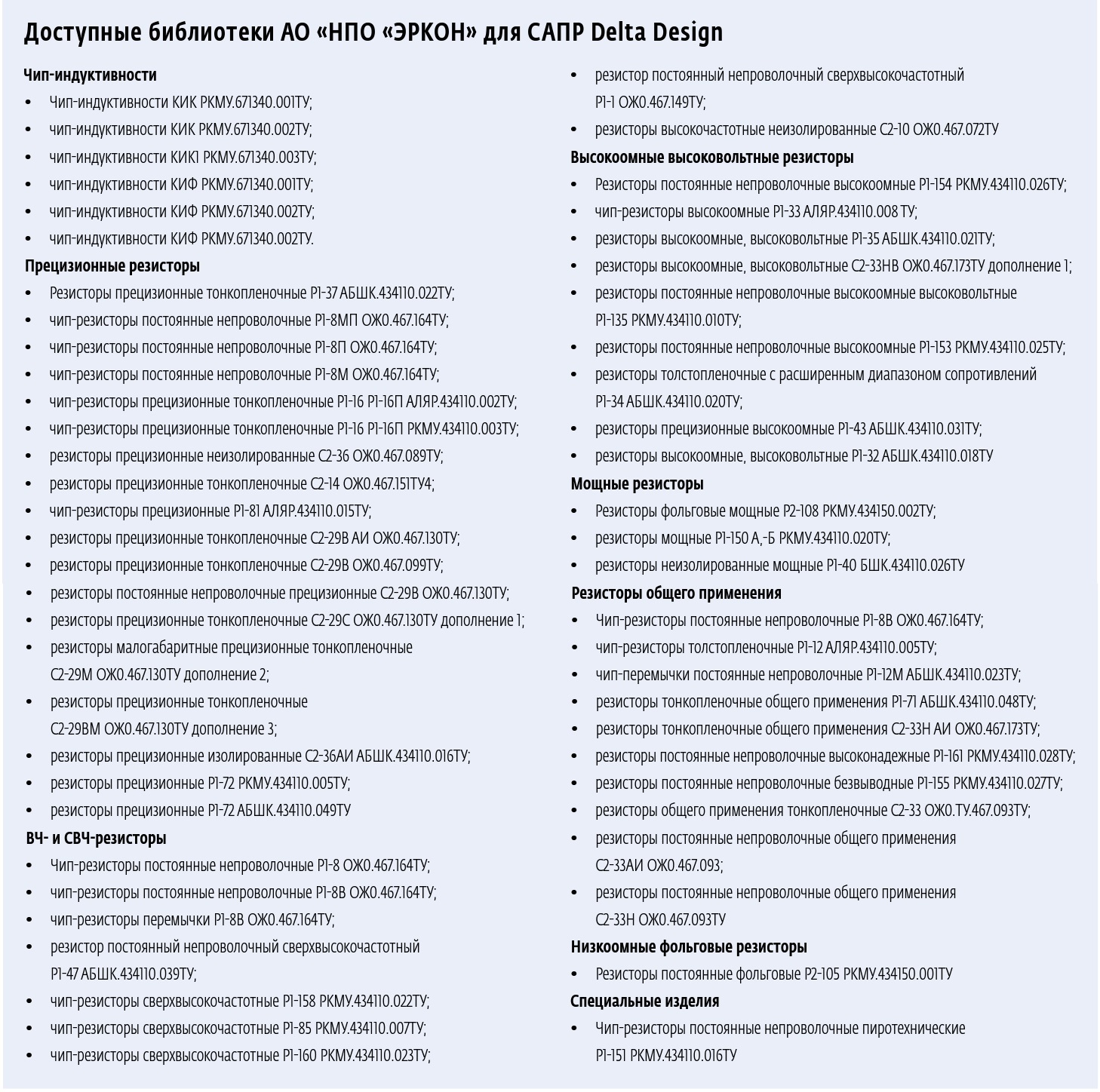 Компания «НПО «ЭРКОН» выпускает пассивные электронные компоненты (резисторы, резистивные поглотители, чип-индуктивности и специальные изделия) и разрабатывает их модели и библиотеки, включая условные графические обозначения (УГО), посадочные места, трехмерные и поведенческие модели. Библиотеки моделей адаптированы для применения в различных средах проектирования, таких как Delta Design [1]. На сайте АО «НПО «ЭРКОН» доступны библиотеки выпускаемых компонентов [2] для САПР Delta Design. Перечень разработанных и доступных библиотек приведен во врезке.