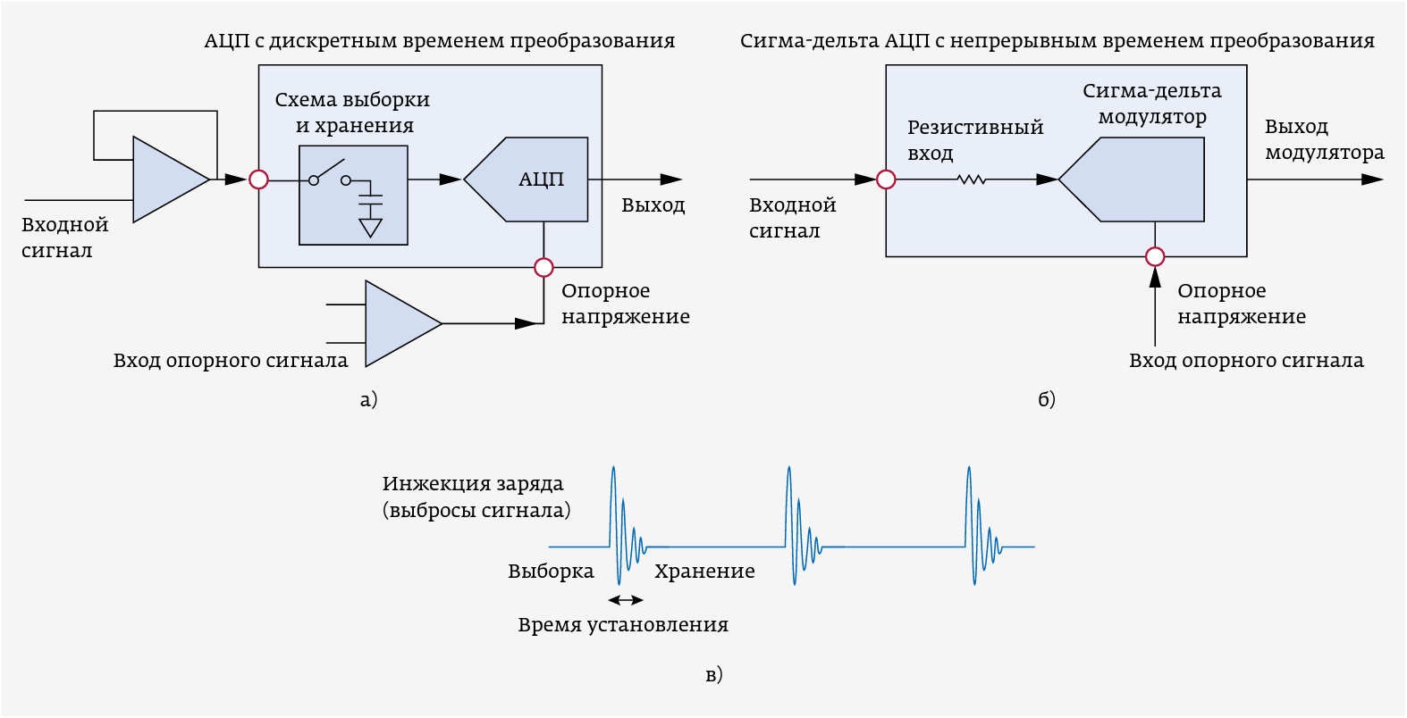 В традиционных преобразователях с дискретным временем преобразования, таких как АЦП последовательного приближения или сигма- дельта АЦП, применяется топология с переключаемыми конденсаторами на входах АЦП и опорного сигнала. Различают две фазы работы такой схемы: выборка и хранение. Они соответствуют заряду и разряду «удерживающего» конденсатора. Тем самым, необходим ток, достаточный для заряда и разряда, а также для поглощения заряда из-за паразитных явлений (выбросов сигнала из-за инжекции заряда). Многие датчики не могут обеспечивать такие высокие токи и, следовательно, требуют буферизации. Помимо этого, драйвер должен быть достаточно быстрым (с малым временем установления и высокой скоростью нарастания сигнала), обеспечивая установку выходного сигнала в конце фазы выборки с тем, чтобы в полезный сигнал не вносились помехи (см. рис. 1в). Таким образом, требования, предъявляемые к драйверу АЦП, очень высоки.