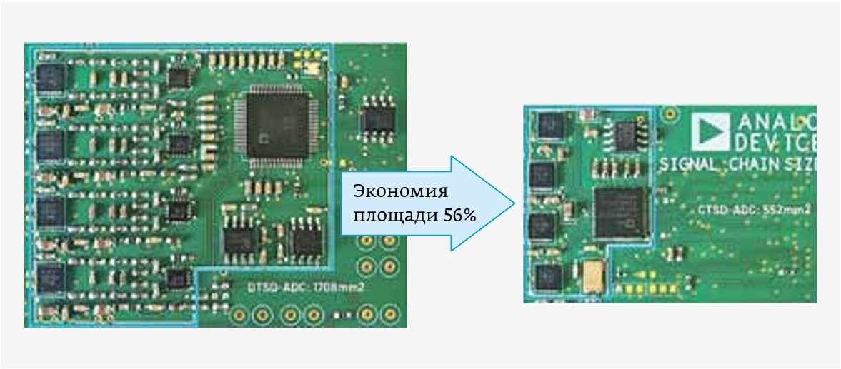 На рис. 1 сравнивается топология сигнальной цепи на основе традиционного АЦП с дискретным временем преобразования и на основе сигма- дельта АЦП с непрерывным временем преобразования. По сравнению с традиционным решением, сигма- дельта АЦП с непрерывным временем преобразования позволяют уменьшить размер изделия до 68% (рис. 2).