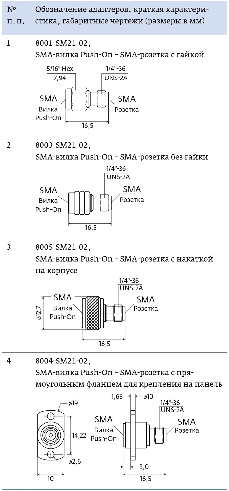 Начиная с 1997 года эта компания выпускает серию адаптеров Push-on- RF & Microwave различного конструктивного исполнения с соединением защелкиванием без блокировки (Push-On, Non-Locking) (табл. 1) [6].