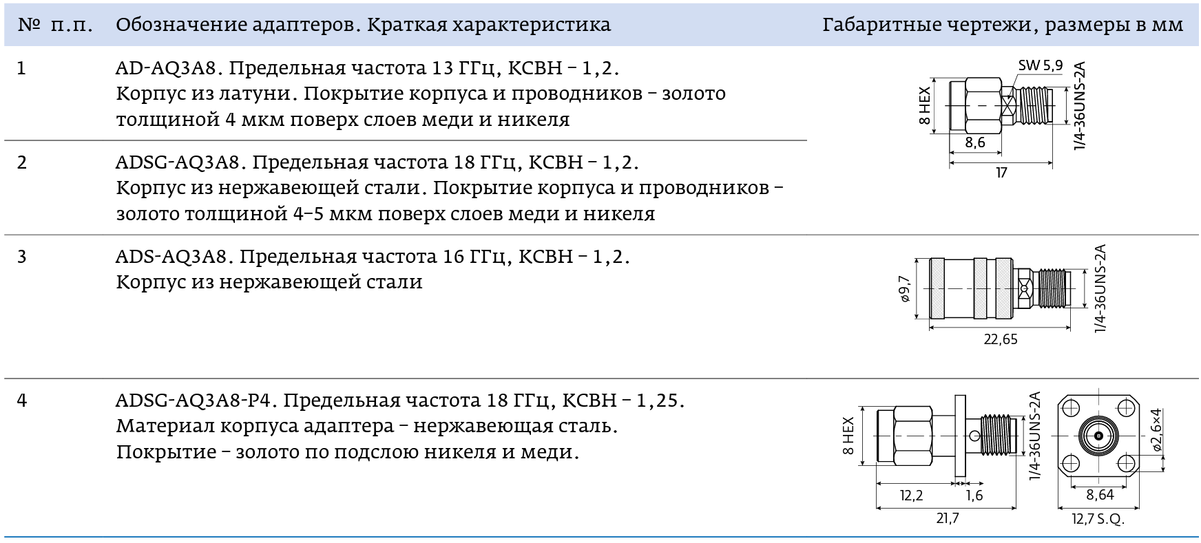Материал корпуса адаптера – пассивированная нержавеющая сталь. Внутренние коаксиальные проводники выполнены из бериллиевой бронзы и покрыты золотом толщиной 2,54 мкм по подслою никеля толщиной 2 мкм. Габаритные размеры адаптера: длина 24 мм, диаметр 8,9 мм [16].