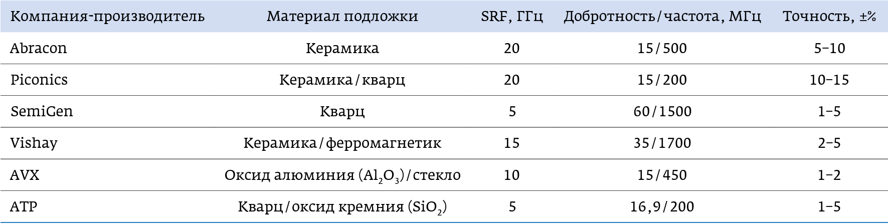 Таблица 2. Характеристики пленочных индуктивностей основных производителей
