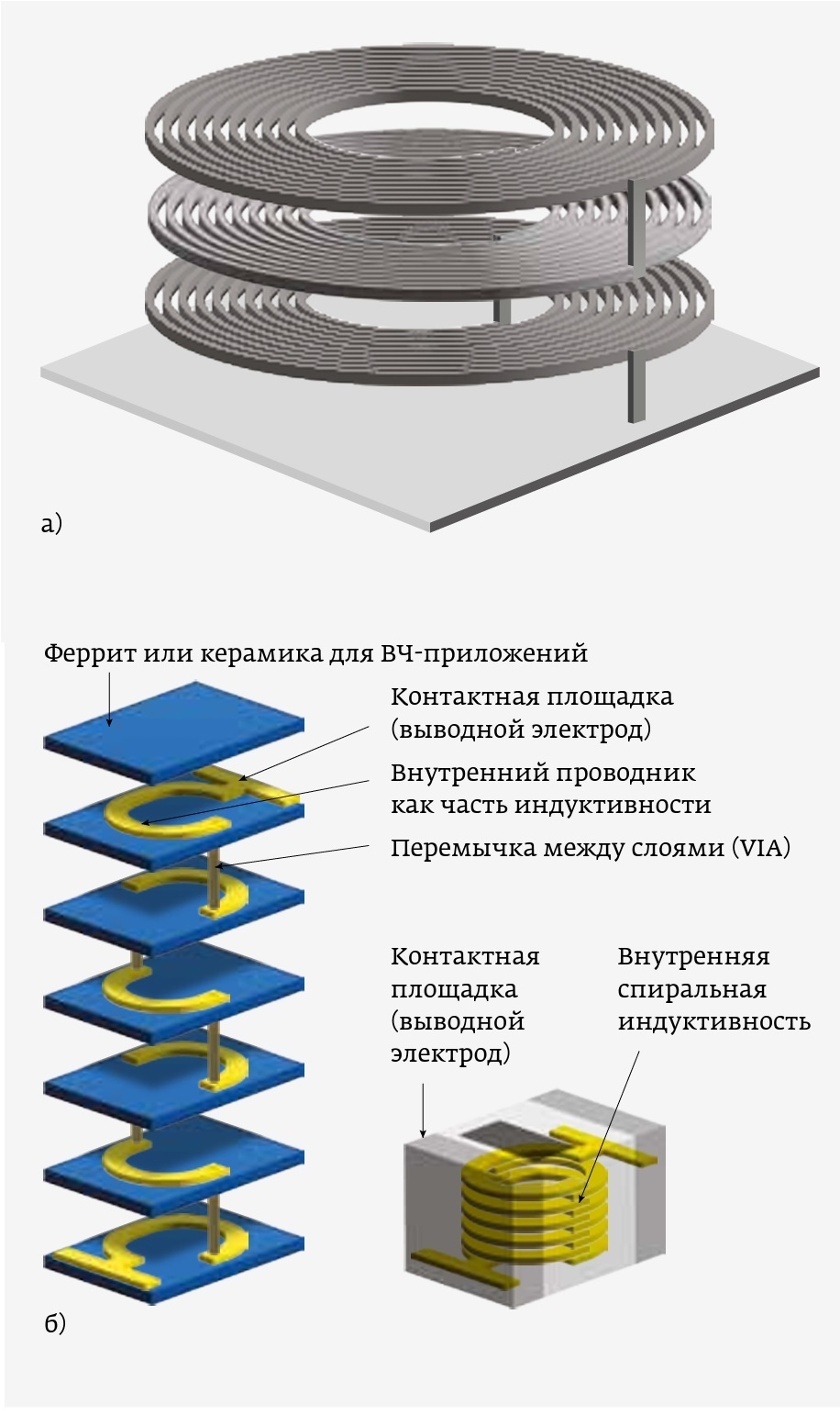 Прямым продолжением пленочных индуктивностей являются многослойные индуктивности. Подобное утверждение основано на том, что одним из способов изготовления многослойных индуктивностей является их формирование из однослойных пленочных индуктивностей. Следует отметить, что понятие «многослойный» касается, в первую очередь, конструктивного исполнения и поэтому многослойными могут быть индуктивности разных видов. На рис. 15 приведены конструкции многослойной индуктивности с воздушным сердечником (рис. 15а [21]) и многослойной индуктивности, набранной из слоев пленочных индуктивностей (рис. 15б [22]). Как видно из рис. 15, принципиального различия в конструкциях нет, за тем исключением, что конструкция из пленочных индуктивностей гораздо более технологична. Кроме того, пленочные индуктивности обладают существенно более высокой точностью за счет технологии изготовления. Следует отметить, что в том случае если слои многослойной индуктивности имеют совмещенные выводы (как это показано на рис. 15), то мы имеем дело именно с многослойной индуктивностью.