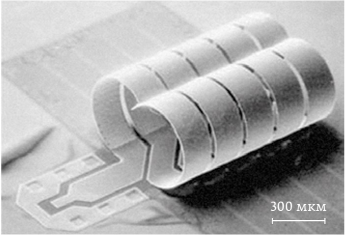 Применительно к индуктивностям МЭМС-технология заключается в удалении части подложки таким образом, чтобы объемная структура индуктивности оказалась приподнятой над подложкой. Или наоборот – наращивание над подложкой заданной структуры. На рис. 16 [24] приведена полученная с помощью электронного микроскопа фотография двойного соленоида, изготовленного методом наращивания над подложкой.
