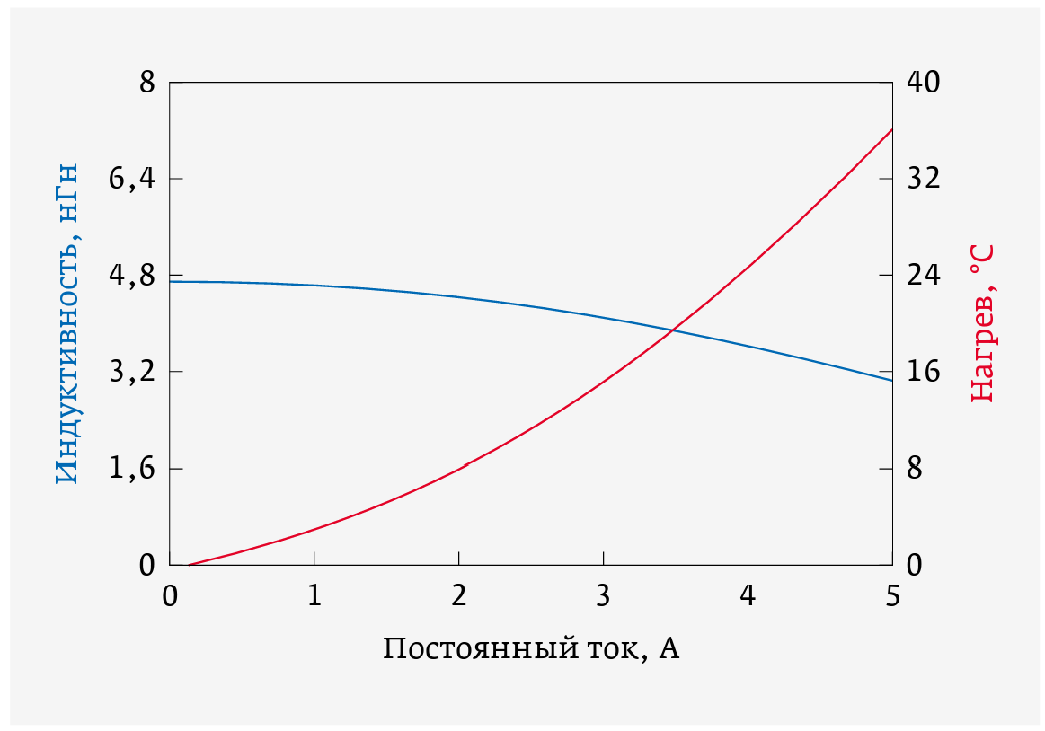 Следует остановиться еще на одном важном моменте при выборе индуктивностей для больших токов. При протекании тока через индуктивность происходит ее нагрев и, соответственно, изменение геометрии. Это соответствует изменению индуктивности и чем больше сила тока, тем больше изменяется значение индуктивности по сравнению с номинальным. Зависимость индуктивности и нагрева от силы протекающего тока показана на рис. 18 [26].