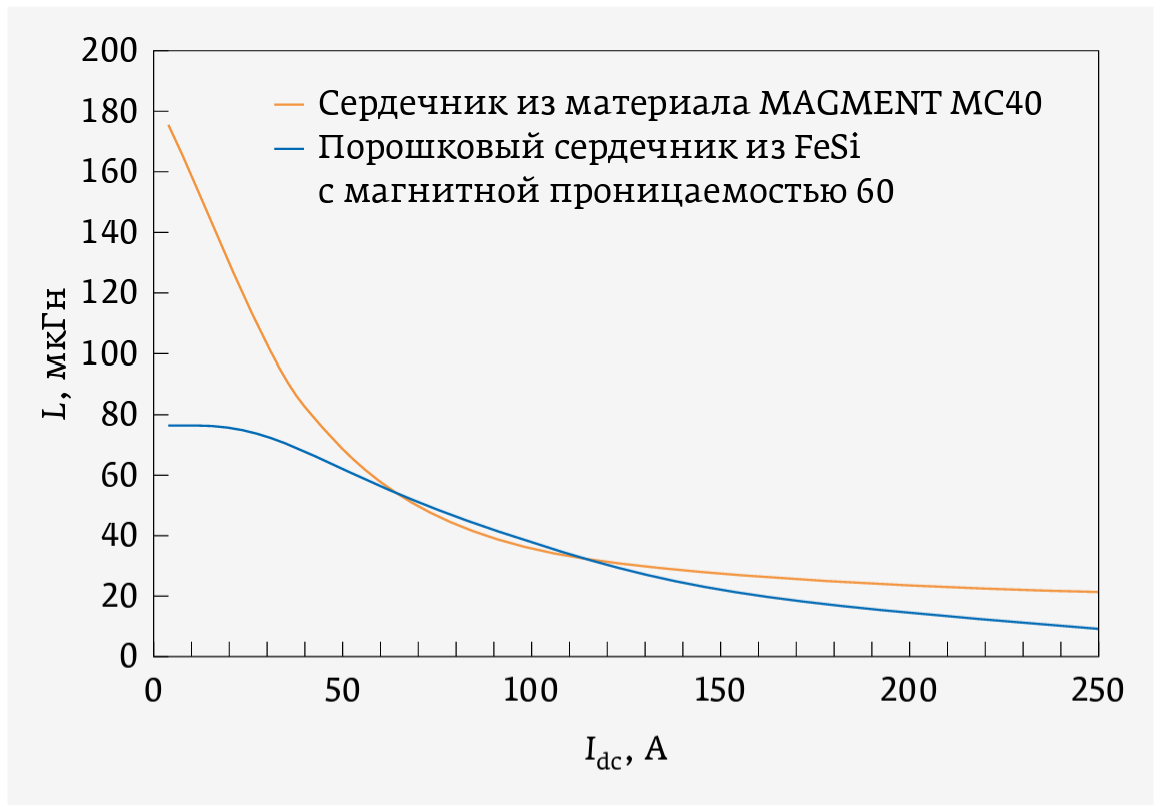 Рис. 17. Зависимость индуктивности (L) от силы постоянного тока (Idc ) для индуктивностей с сердечниками, выполненными из разных материалов