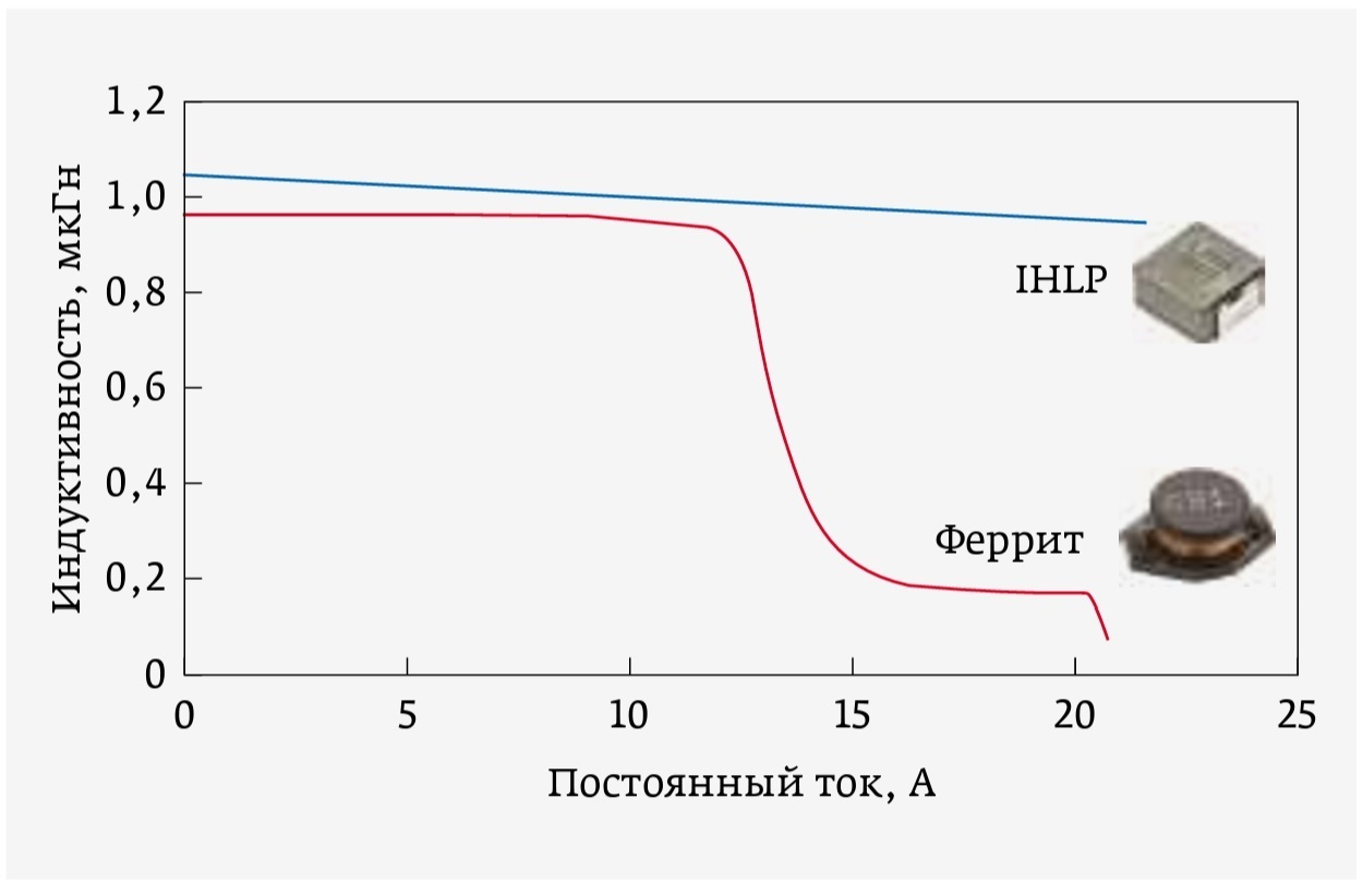 Из рис. 21 видно, что для индуктивностей из композитных материалов (технология IHLP) линия зависимости индуктивности от силы протекающего тока имеет малый наклон. Это говорит о том, что влияние тока на номинал не очень существенно. А у индуктивностей на основе феррита наблюдается резкое падение номинала при достижении током определенного значения. Это происходит в результате того, что магнитная проницаемость ферритового сплава резко падает за счет нагрева. Таким образом проявляется эффект, обратный магнитострикции, когда за счет нагрева изменяются геометрические размеры сердечника и, соответственно, магнитная проницаемость материала. Сила тока, при которой наблюдается этот эффект, зависит от типа феррита. Собственно, феррит представляет собой сплав, химическую формулу которого можно представить в виде MeFe2 O4, где Me – металл, который добавляют в сплав. Поэтому в зависимости от того, какой именно металл входит в состав феррита, сила тока, при которой происходит резкий спад магнитной проницаемости, меняется.