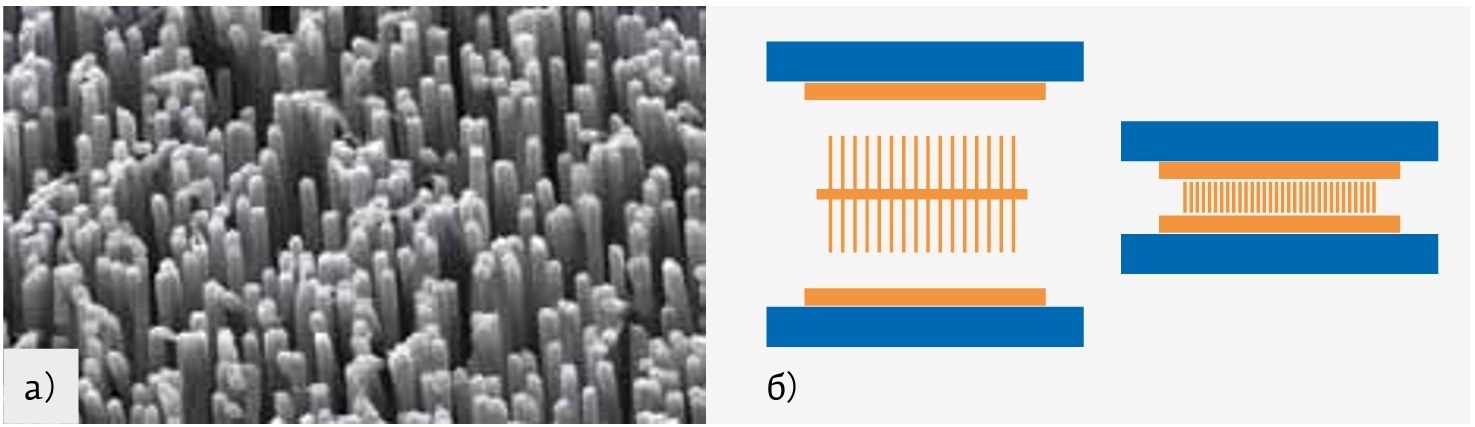 Рис. 2. Твердофазное соединение массивов [4]. Технология межсоединений NanoWiring (а), массив медных нанопроводников (б)