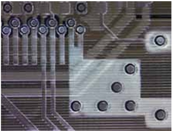 Для формирования межслойной изоляции использовалась печатная технология фотоотверждаемого полимера на основе акрилов. Внешний вид фрагмента четырехслойной печатной композиции, полученный по технологии каплеструйной печати, иллюстрирует рис. 14. Важно, что в основу реализуемого процесса положена низкотемпературная технология с использованием наноструктурированного серебра, позволяющая без шаблонов каплеструйным методом реализовать произвольное коммутационное поле.
