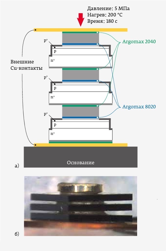 Дальнейшие операции по последовательной коммутации базовых элементов осуществлялись с использованием пасты Argomax, которая с помощью шприцевого дозатора наносится на спейсер и на внешние обкладки сборки из трех базовых кристаллов элементов (рис. 4). Далее при температуре 200 °С, давлении 5 МПа в течение 3 мин проводился синтеринг, после чего полученная диодная сборка герметизировалась.