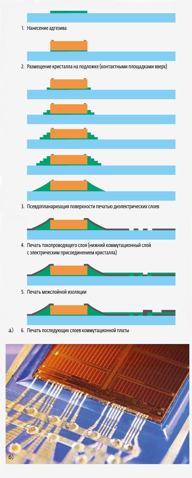 Рис. 15. Последовательность этапов монтажа каплеструйной печатью утоненного кристалла на гибкую плату (а) и фото смонтированного утоненного кристалла памяти (б)