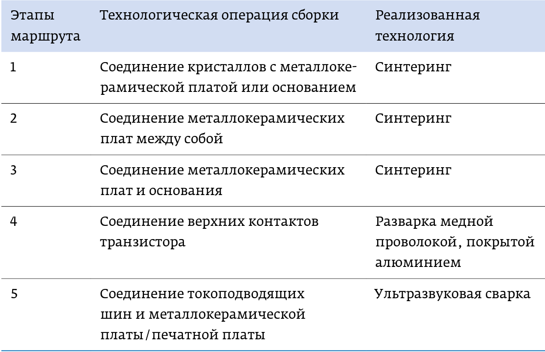 Одним из подходов для снижения вероятности отказов межсоединений была определена технология синтеринга. Исследование и оптимизация параметров процесса сингтеринга для всех значимых соединений в разрабатываемом силовом блоке позволили разработать технологический маршрут изготовления силовых модулей, наиболее значимые операции которого в рамках технологий сборки представлены в табл. 1.