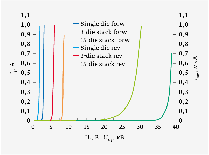 Рис. 5. Прямые и обратные ветви ВАХ для одиночного 4H‑SiC p+‑p‑n+‑перехода и последовательных сборок из 3‑х и 15‑ти переходов [8]