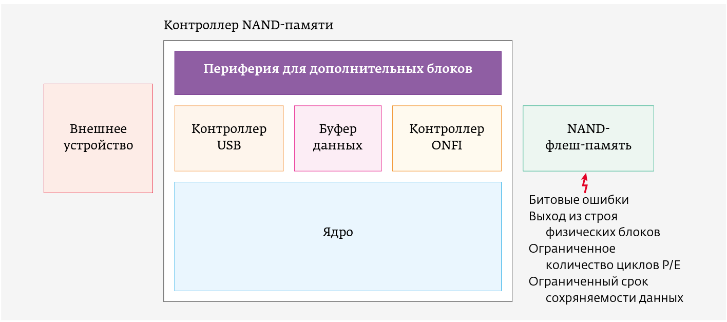 Контроллер – это «мозг» USB-накопителя, который позволяет достичь высокого качества работы и увеличить срок службы памяти. Он обеспечивает взаимодействие с вычислительной системой, поддержку функции записи / чтения данных с заданной скоростью и контролирует состояние ячеек. Встроенное программное обеспечение (ВПО) контроллера реализует алгоритмы трансляции логических адресов накопителя в физические адреса флеш-памяти, отвечает за сохранность данных, неизменность емкости, контроль целостности данных и исправление битовых ошибок, возникающих в структуре NAND-памяти (рис. 3). Помимо того, микросхема занимается очисткой памяти от мусора, выравниванием износа, контролем и заменой неисправных блоков.